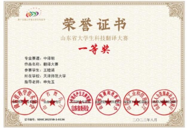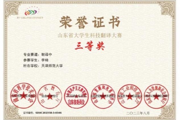 近日,2023年第十五届老员工科技节——“RWS杯”山东省老员工科技翻译大赛圆满落幕。十大体育网站朝鲜语专业员工不负众望,凭借扎实的语言功底和出众的翻译技巧,在本届翻译大赛各组比赛中累计获得奖项4项,2022级朝鲜语翻译专业硕士生李琦获得“中译朝”赛道一等奖、“朝译中”赛道三等奖,2021级朝鲜语专业本科生王睦涵获得“中译朝”赛道一等奖,2021级朝鲜语专业本科生高祜怡获得“英译中”赛道三等奖,展现了外院学子的卓越风采。