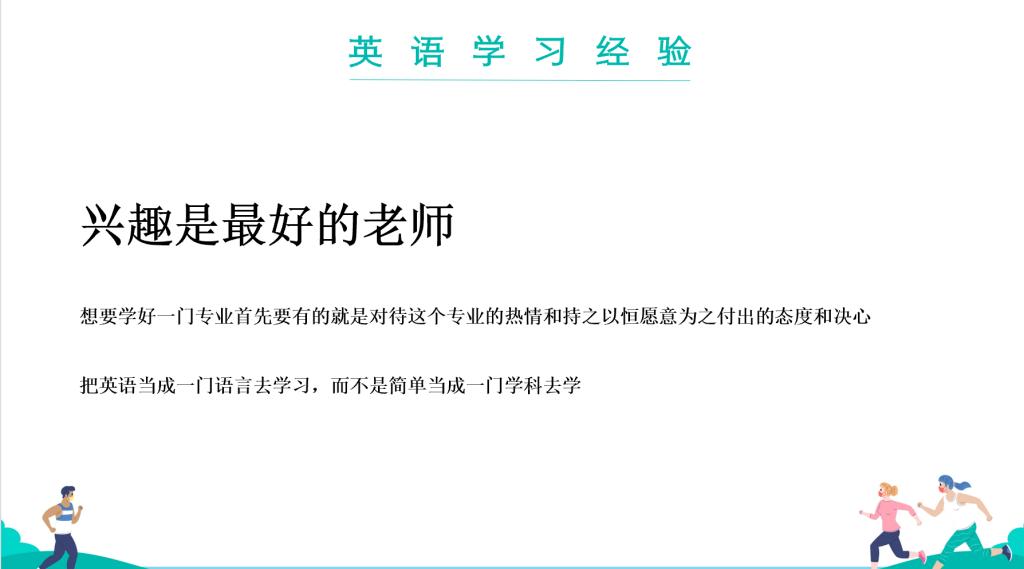 袁雅艳同学从个人学习英语的经验出发,强调兴趣的重要性,在学习语言时要注重输入与积累,分别在阅读、听力、口语方面分享了自己的练习经验以及日常积累学习所使用的相关素材。同时,在学习语言时,不应局限于语言本身,更应探索其他领域所感兴趣的知识,永远抱着一颗学习的态度面对世界,克服畏难情绪,尝试更多自认为的不可能。