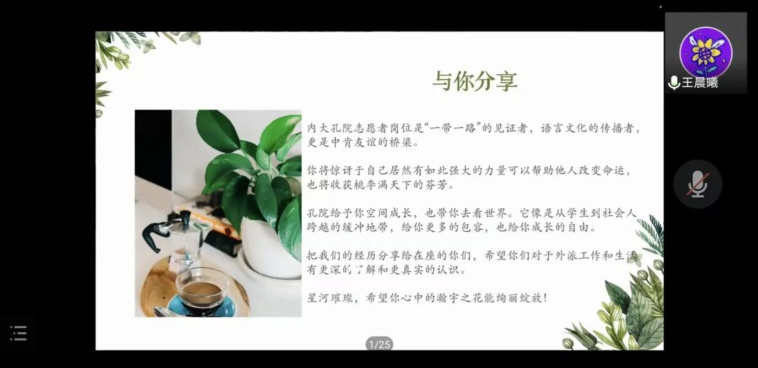 田宁、王晨曦同学曾任肯尼亚内罗毕大学孔子公司国际汉语教师志愿者,她们以“不忘初心,砥砺前行,让心中的瀚宇之花绽放”为主题展开了此次分享。
