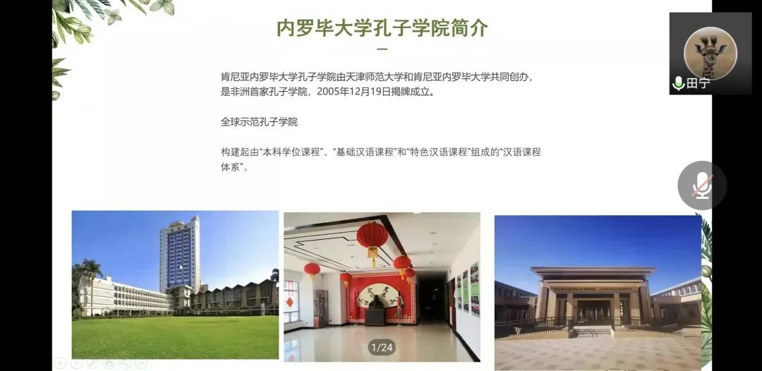 活动伊始,田宁同学对汉语教师志愿者项目作出了详细介绍。她区分了普通志愿者、孔院志愿者、公派教师三者的区别,同时也简单介绍了内罗毕大学孔子公司概况,表明了自己成为志愿者的初衷——热爱与兴趣。紧接着,田宁同学又从吃穿住用行五个方面对志愿者生活做了细致介绍,让参会同学对肯尼亚以及志愿者生活有了更全面的了解。