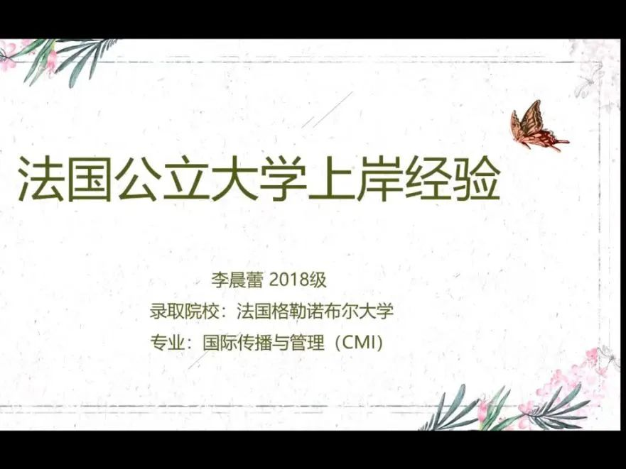 另外,李晨蕾同学还向同学们介绍了法国公立大学申请的经验,让同学们进一步了解了法国留学的相关信息及相关要求,开拓了同学们对于读研深造的眼界。