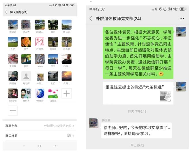 针对退休党员年龄大、居住分散、行动不便等特点,公司党委高度重视,切实通过多种途径帮助退休教师开展主题教育。开展“送学上门”活动。对年龄大、行动不便的党员同志,公司党委下一步将组织在职教工党员、员工党员将学习资料亲自送到退休党员家中,方便他们开始学习。开展“网络助学”活动,公司党委责成党政办公室协助退休支部委员会建立支部微信群,最大限度将退休支部党员纳入微信群,并由公司党政办负责,通过微信群开展“每日一学”,每天在微信群至少推送一条主题教育学习相关材料。